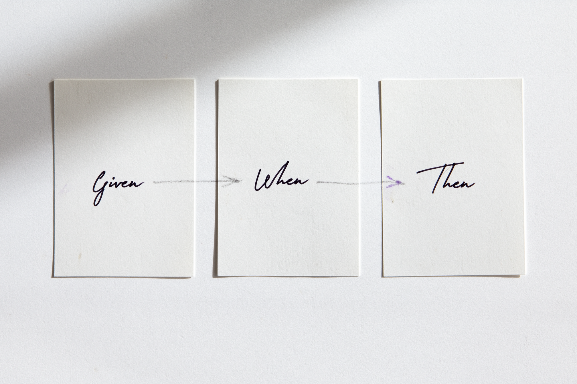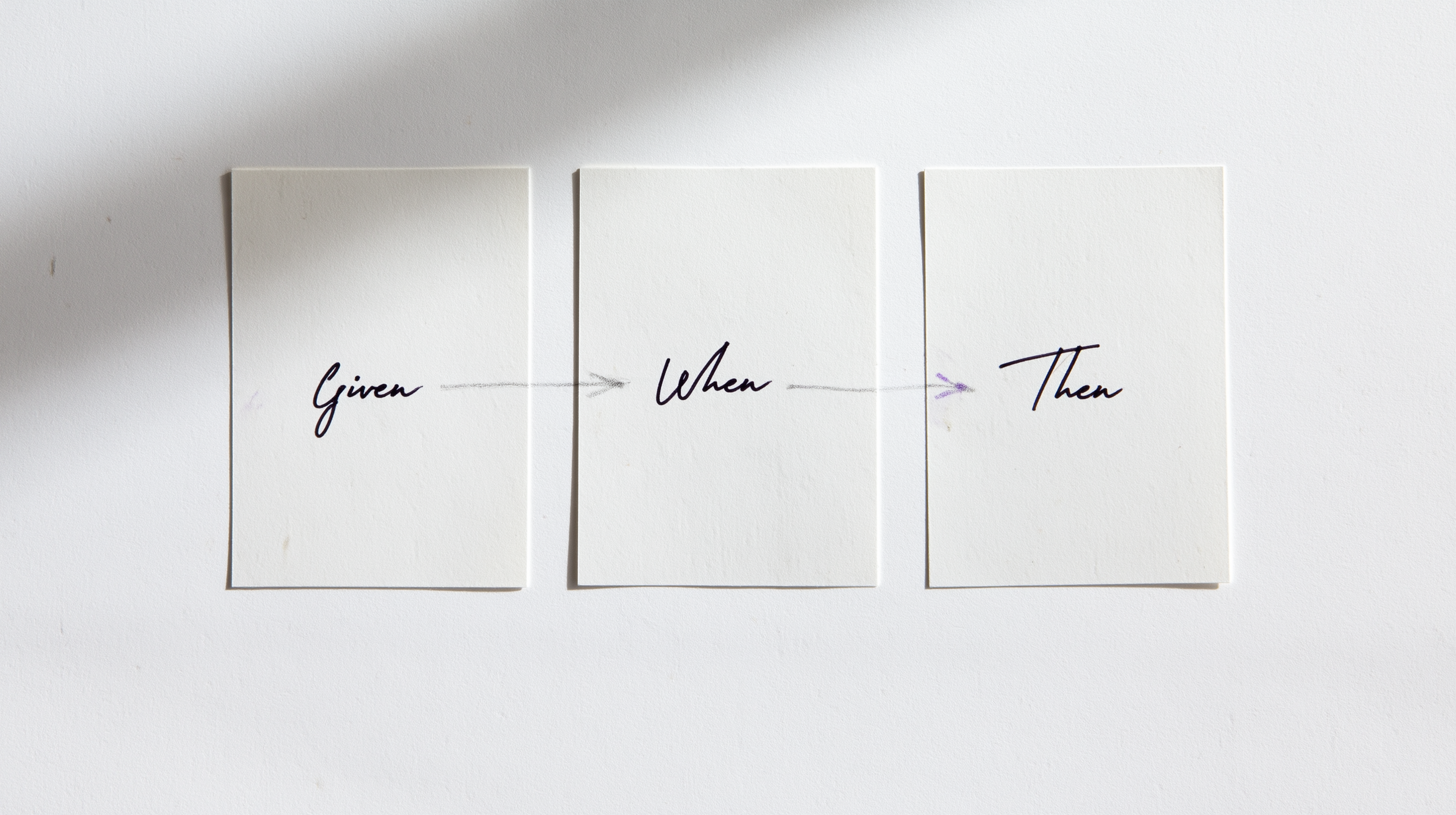 Givenis a precondition. It describes a state of the world that is already true when the scenario starts. Something observable. Something verifiable. Not something the user does - something that is.Whenis a single action. One event. The user does one thing. Not a sequence of steps. Not "and then." One.Thenis an observable outcome. What the world looks like after the action - something a person could verify by looking at the screen, not what the system does internally.